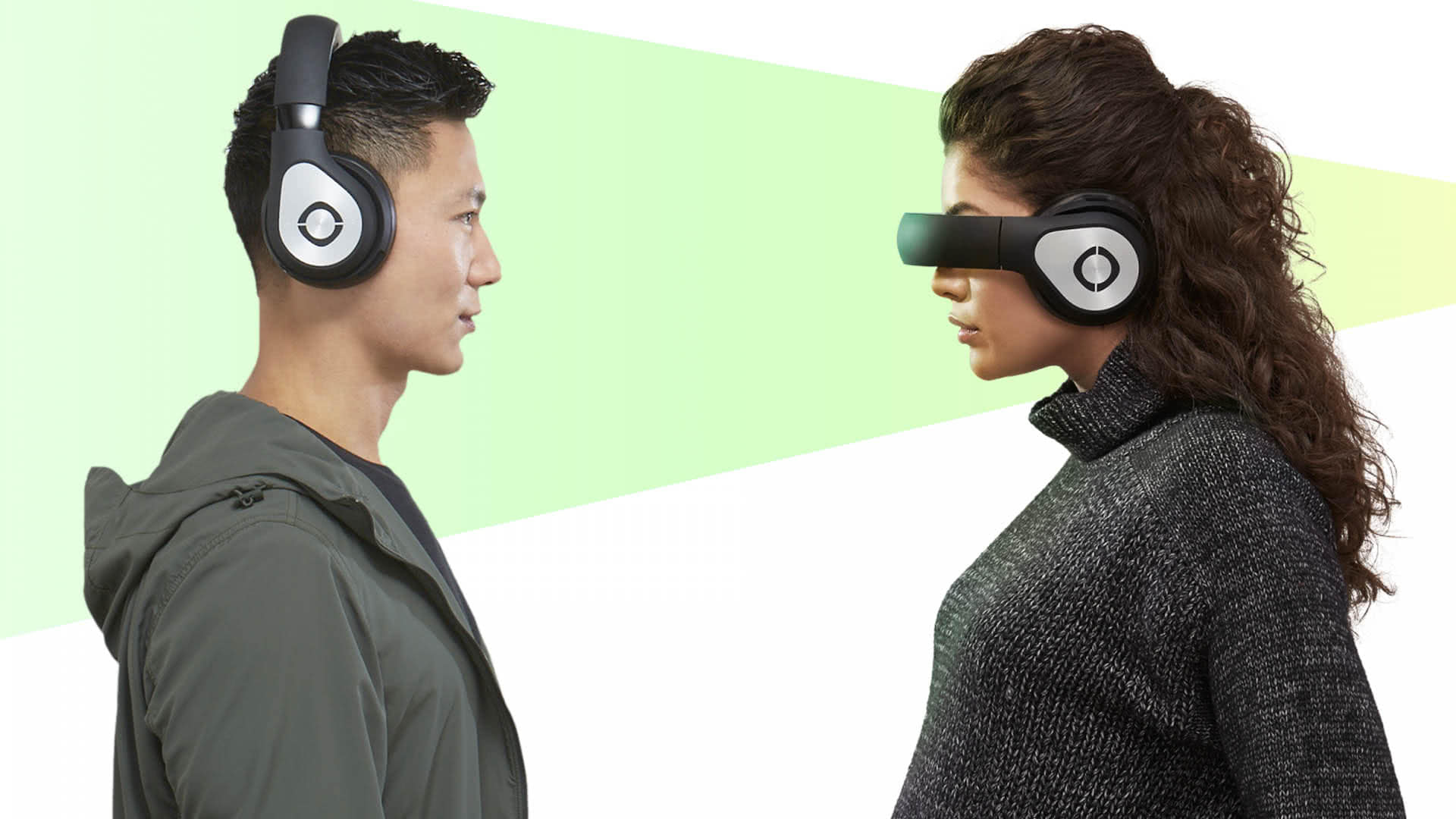 我在Avegant的展台上试玩了这款外观奇特的Glyph眼镜。与其说是VR眼镜,不如说是带了双目显示的高端耳机。首先它的外形就跟我们传统理解的VR眼镜有很大的区别,如果没有人告诉我,我一定以为它是一款高端耳机,直到有人把它旋转90度戴在眼前: