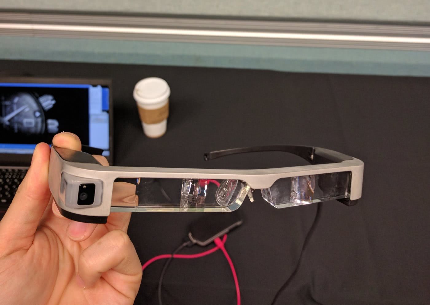 在试戴了BT-300之后,我感觉显示效果相比前代有了很大的提升,不仅分辨率从540p增加到了720p,因为采用OLED屏的原因,色彩和对比度都有明显的提高,比如黑色背景会显示的更加透明自然。同时因为是双目显示的原因,双眼可以正常平视前方,视域也比较宽,不会出现佩戴谷歌眼镜时单眼斜视的囧样。