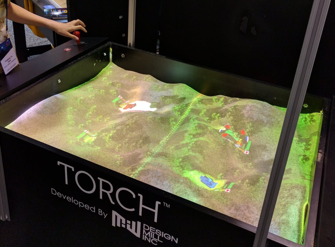 现在大家谈论很多AR和VR的游戏,都是要佩戴额外的头盔和显示设备。Design Mill带来了一种全新的裸眼AR玩法:通过Intel的RealSense距离感应器和高分辨率投影仪构筑一个虚拟的游戏环境,打造了这款沙盘坦克对战游戏。游戏开始前双方先手动堆筑沙堆,RealSense相机扫描并构筑相应的地形,然后由上方的投影仪投射相应的图像。游戏中不同的地形高度会有不同的效果,比如坦克速度,炮弹轨迹等。