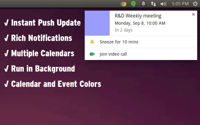 Our app does not collect or share any of your personal information or credentials. We use Google Calendar API to access and retrieve the calendar events and utilize Chrome Identity API to provide the secure user authentication.